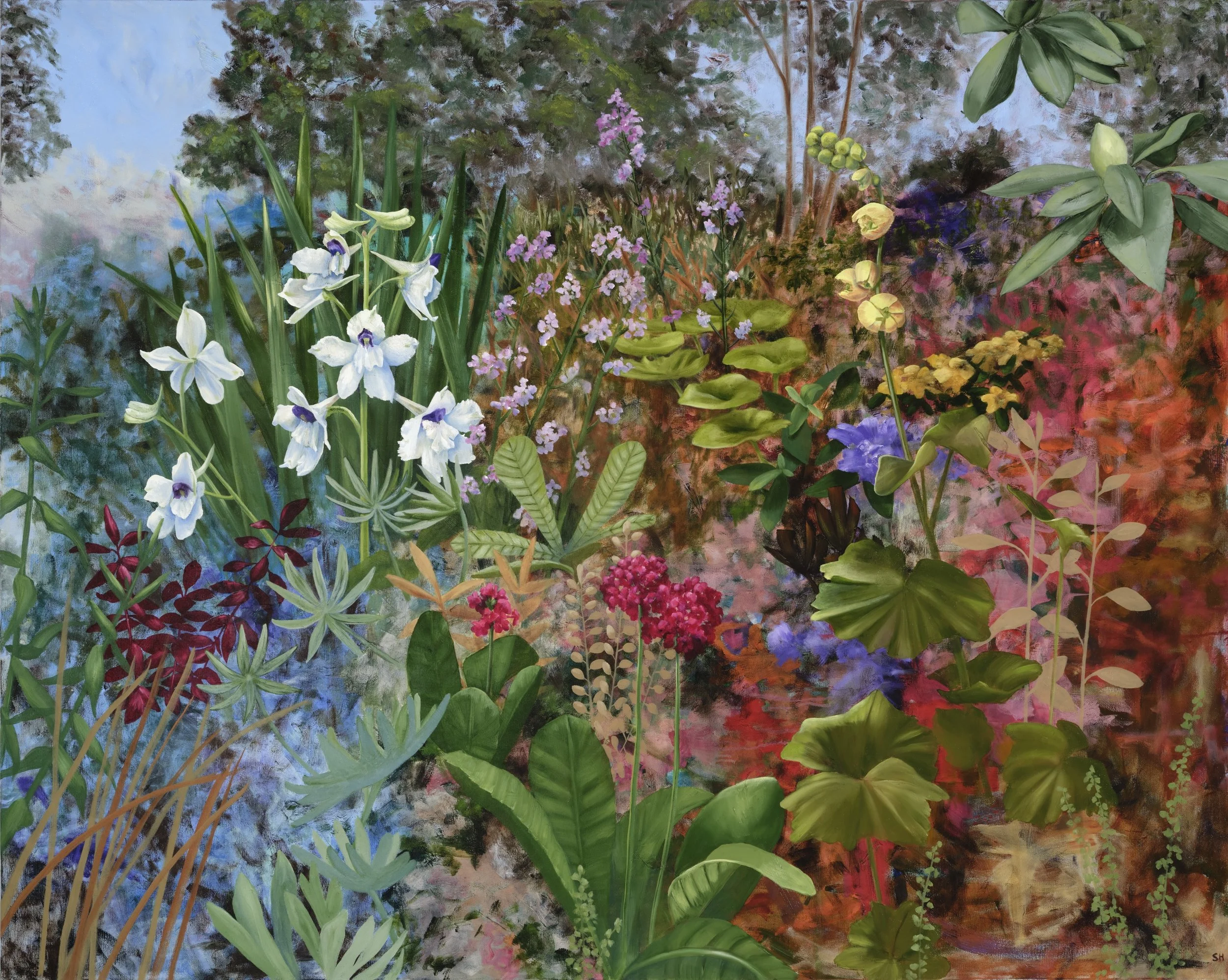 This is a fantasy landscape that combines multiple garden plants with the endangered Peacock Larkspur, a native plant that grows primarily in the middle Willamette Valley. Development, urbanization, road maintenance and herbicides have all contributed to the Peacock Larkspur’s decline.